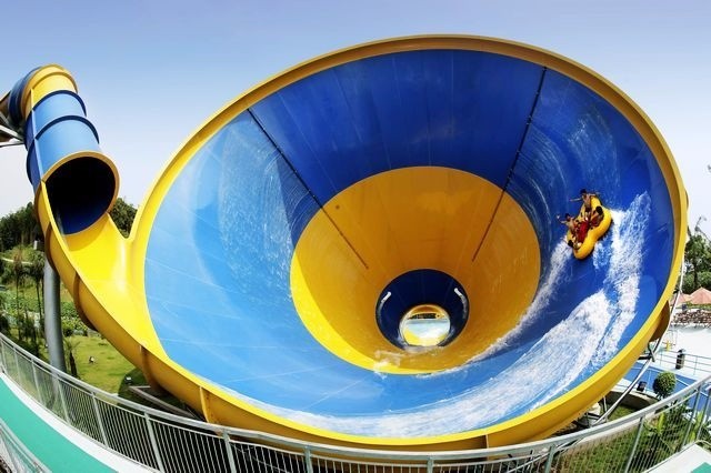 · 超級大喇叭,受歡迎的大型水上設(shè)備之一。坐在特別設(shè)計(jì)的四葉草型浮圈里面滑行,從16米高空滑行到直徑約21米的巨大的喇叭型圓錐體里面,像是被龍卷風(fēng)吸進(jìn)去的感覺。