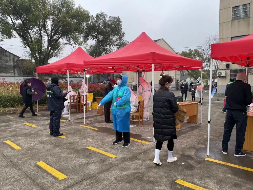 當(dāng)天,是全鎮(zhèn)做核酸檢測(cè)的日子,黨員們帶著N95口罩,口袋里還放一小瓶消毒酒精,來(lái)到了鎮(zhèn)政府的核酸采集點(diǎn),每位志愿者、黨員干部紛紛忙碌著,進(jìn)大門(mén)的每一個(gè)人,志愿者都要檢查健康碼是否是綠色的,然后再測(cè)量體溫。一共有兩個(gè)通道,其中一個(gè)是愛(ài)心通道,老人和小孩都可以從愛(ài)心通道通過(guò)。排隊(duì)的人都留了一米遠(yuǎn)的間隔,那是安全距離,防止病毒攜帶者交叉感染。公司黨員不顧淋著雨,口中重復(fù)著:這邊排隊(duì),一米安全距離,打開(kāi)健康碼,戴好口罩……