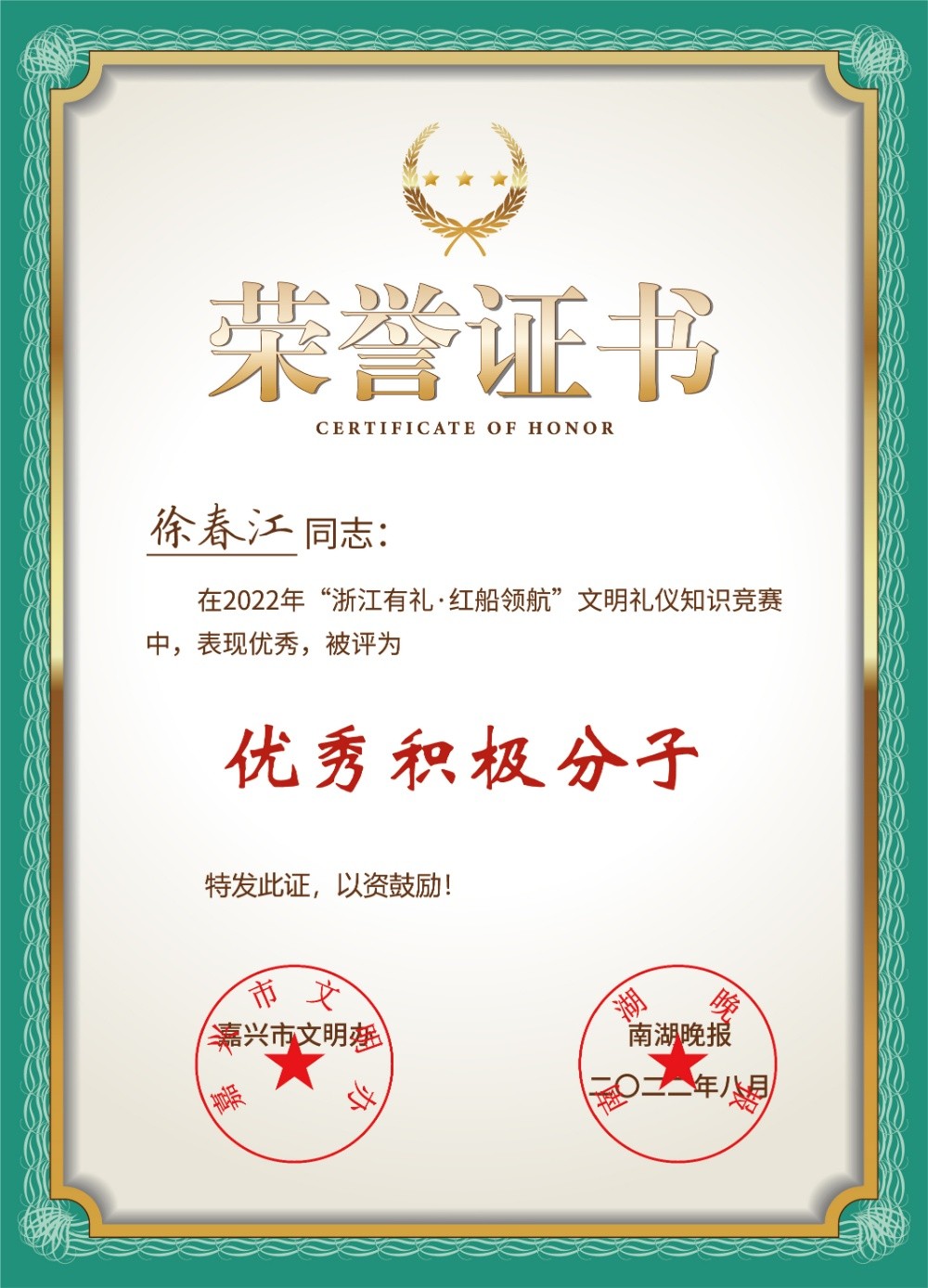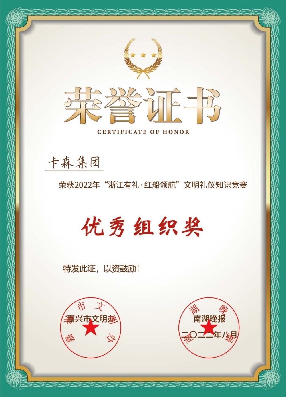 日前,“浙江有禮·紅船領(lǐng)航”文明禮儀知識競賽落下帷幕,海寧市獲得了總戰(zhàn)報參與率第一的好成績!我們卡森集團(tuán)榮獲優(yōu)秀組織獎,中共黨員徐春江、陳雪江榮獲優(yōu)秀積極分子。