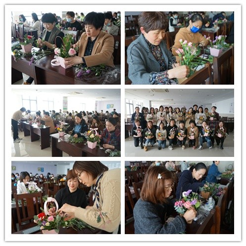 女人愛(ài)花也愛(ài)美。大家一絲不茍地跟著老師的節(jié)奏一朵一朵將花插入花籃,插出自己喜愛(ài)的款式,也插出節(jié)日愉快的心情,過(guò)節(jié)氛圍霎時(shí)也開(kāi)出了花來(lái)。