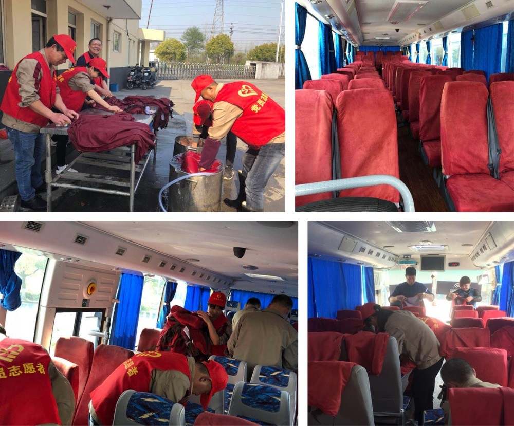 在大家一個(gè)上午團(tuán)結(jié)認(rèn)真的清洗下,134套座椅套清洗干凈,晾曬完成。下午三點(diǎn),整潔而又鮮亮的座椅套“各就各位”被安裝上座位,班車車廂舊貌換新顏,同志們都感到很欣慰!他們以勞動(dòng)為榮,樂在其中,能吃苦,作奉獻(xiàn),體現(xiàn)了恒森支部的號(hào)召力和精神風(fēng)貌。